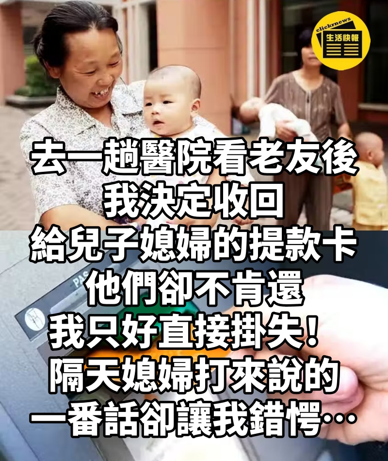 「去一趟醫院看老友後,我決定收回給兒子媳婦的提款卡,他們卻不肯還我只好直接掛失!隔天媳婦打來說的一番話卻讓我錯愕…」